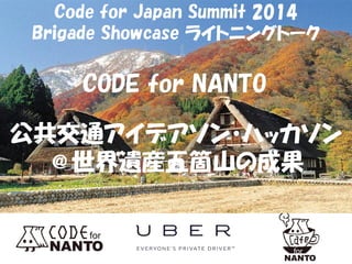 2014/10/11 Code for Japan Summit Brigade Showcase ライトニングトークのプレゼン資料です。 9月13日~15日に行った公共交通ハッカソン@世界遺産五箇山のふりかえりの内容になっております。