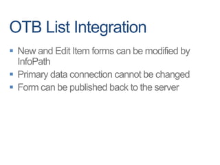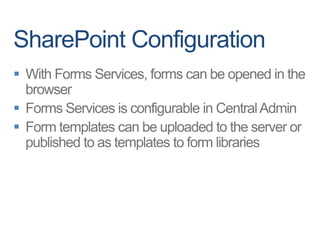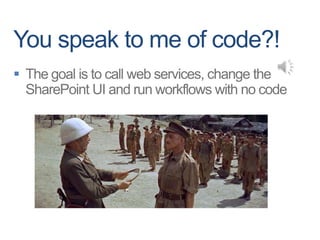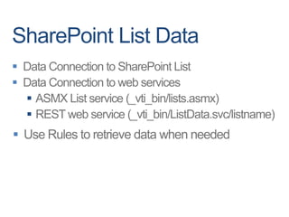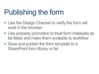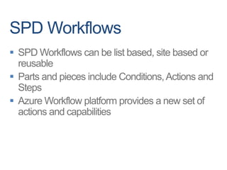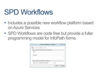 This document discusses custom SharePoint 2013 workflow applications using InfoPath and SharePoint Designer. It provides an overview of Strategic Data Systems (SDS) and the custom SharePoint solutions they offer, including workflow and InfoPath forms, reports and business intelligence integration, portals and collaboration, and content management. It also mentions their agile development practices and a free SharePoint library with reusable web parts and tools.