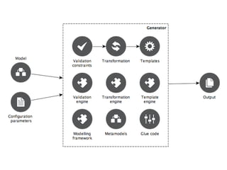 This document discusses code generation as a service, where a client can submit modeling artifacts like UML models to a server which will generate code. The server schedules generation jobs, allows clients to check status, and retrieve results. This simplifies generator deployment by eliminating installation on the client side. Potential downsides include network latency, the server becoming a bottleneck, and confidentiality issues. Future work ideas involve supporting other backends, private repositories, synchronous execution, sandboxing, improved job management, and a public deployment.