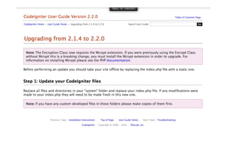 アップグレード ステップ1:CodeIgniterのファイルを更新 あなたの “system”フォルダ内のすべてのファイルおよび ディレクトリを交換し、index.phpファイルを置き換えます。