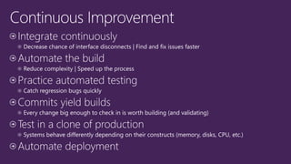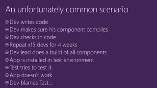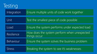 The document outlines a Microsoft Developer Camp led by technical evangelists Nick Trogh and Jan Tielens, focusing on modern app development and agile methodologies. It includes hands-on labs, discussions on continuous deployment, application insights, and the benefits of using tools like Visual Studio Online and Azure. Additionally, it highlights various user plans, agile frameworks, and emphasizes the importance of unit testing for effective software development.