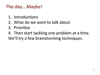 This document outlines an agenda and discussion topics for an advanced agile testing workshop. The workshop will use collaborative problem solving and various brainstorming techniques. Attendees will work in groups to identify testing problems, set goals, and generate experiments to tackle issues. Techniques that will be used include impact mapping, brainwriting, drawing, and discussing solutions if participants had "superpowers". The goal is for attendees to leave with concrete experiments to help address their biggest testing challenges.