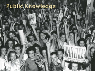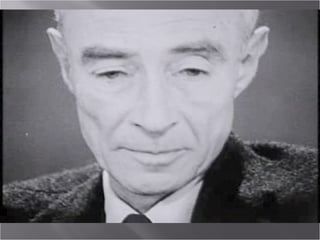 The document provides background information on the development of nuclear fission and the atomic bomb during World War II. It discusses several key scientists involved in the Manhattan Project, including Szilard, Fermi, and Oppenheimer. It describes some of the early nuclear experiments at Chicago and the establishment of the Los Alamos laboratory. It also summarizes the atomic bombings of Hiroshima and Nagasaki and the initial positive public response, as well as some later dissent from scientists about the use of the bomb.