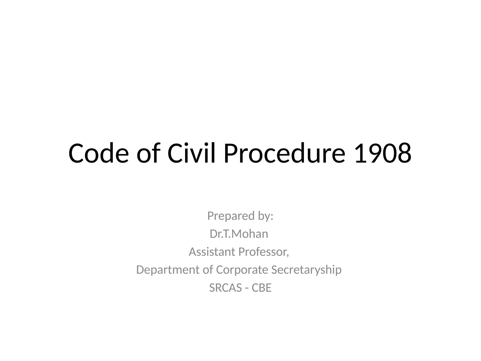 The Code of Civil Procedure 1908 governs civil procedures across India, excluding certain regions like Nagaland and tribal areas unless extended by state notification. Key definitions include 'decree', 'district', and 'foreign court', outlining the roles and functions related to civil suits, such as jurisdiction and execution of decrees. The code establishes that suits should be initiated in the lowest competent court and contains provisions on res judicata and the transfer of decrees for execution.