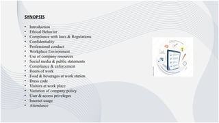 The document outlines the Code of Conduct for employees at SRJ Info Jana Systems Pvt Limited, emphasizing ethical behavior, compliance with laws, and professional conduct. It covers key areas such as workplace environment, use of company resources, confidentiality, social media guidelines, and disciplinary measures for policy violations. Additionally, it details expectations around work hours, dress code, visitor policies, and internet usage to maintain a productive and safe workplace.