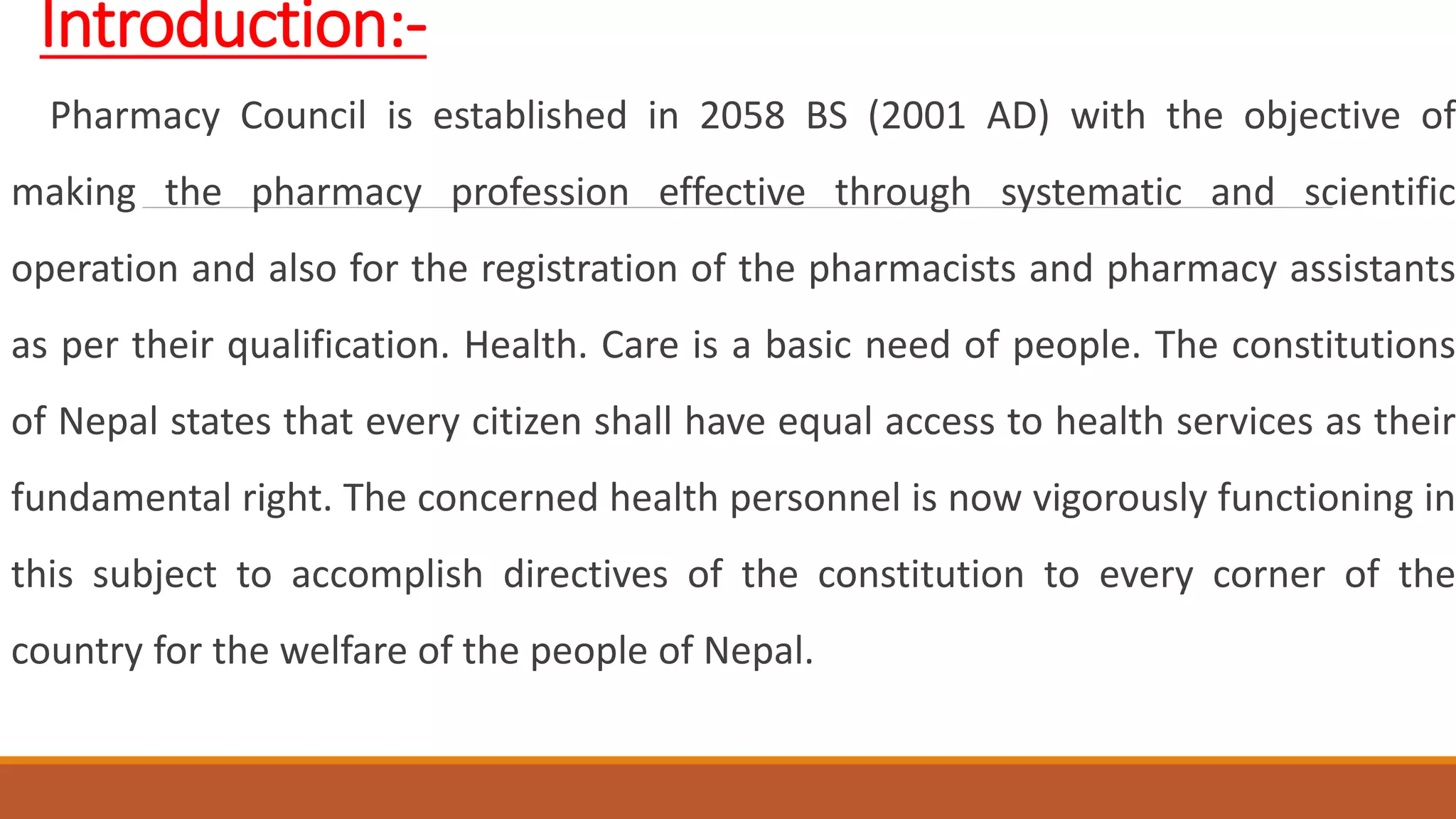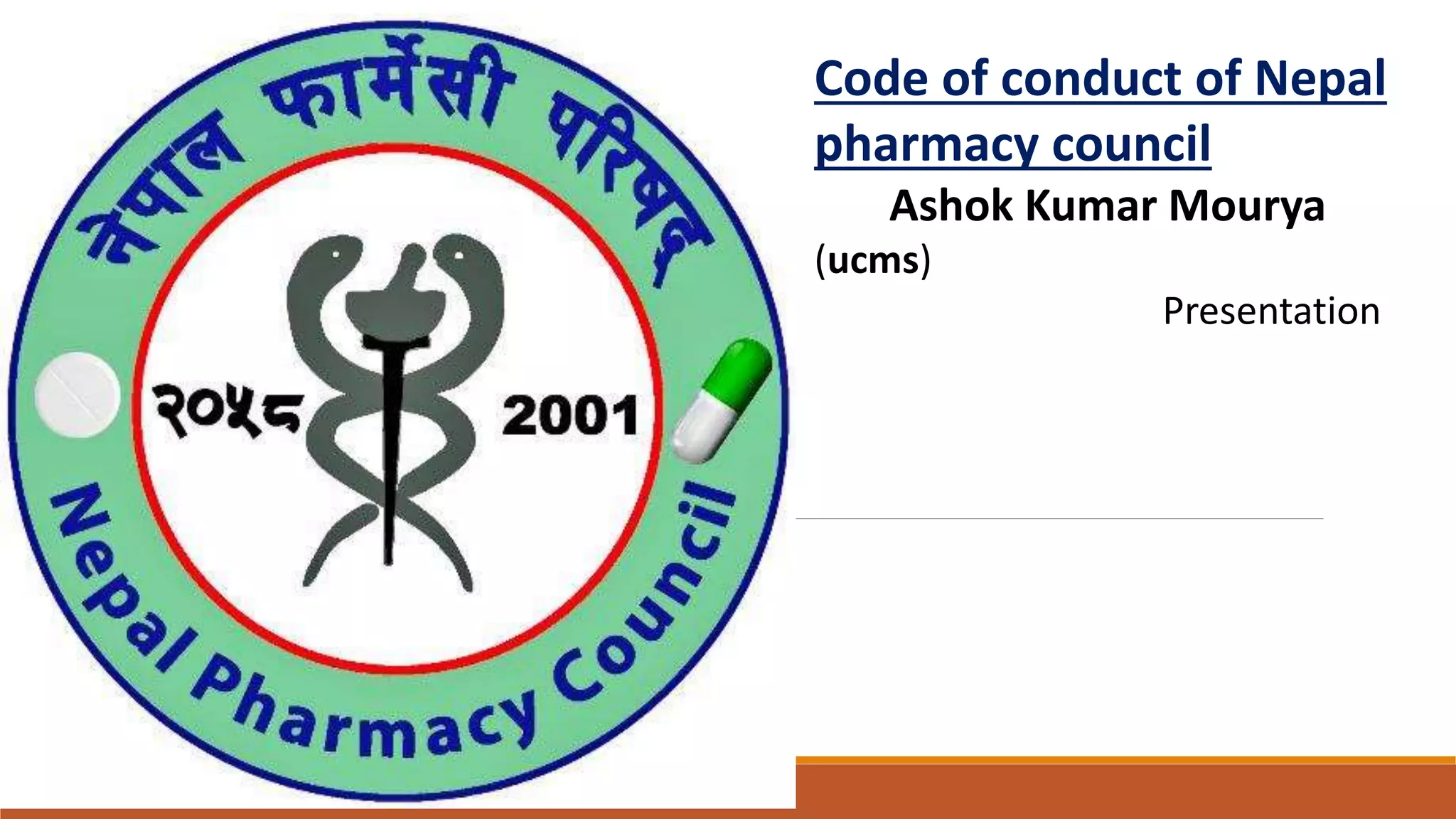 The Nepal Pharmacy Council, established in 2001, aims to enhance the pharmacy profession through systematic operations and the registration of qualified pharmacists. It emphasizes the ethical responsibilities of pharmacists to ensure equitable healthcare and adherence to professional standards while navigating rapid changes in the industrial and healthcare sectors. The code of ethics outlines the duty of pharmacists to maintain patient confidentiality, uphold professional integrity, and contribute to public health without discrimination.