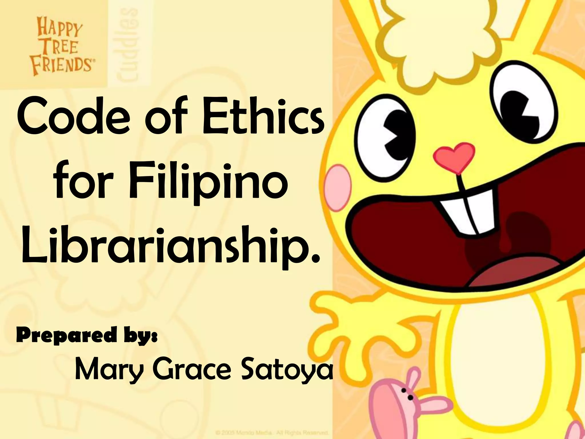 This document outlines a code of ethics for Filipino librarians. It addresses librarians' responsibilities to the state and society, their profession, and their clients. Some key points include upholding the constitution and laws, promoting literacy and access to information, improving professional competencies, maintaining confidentiality and impartiality in client services, and avoiding conflicts of interest. The code also specifies disciplinary actions for violations, such as revocation of registration.
