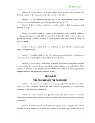 The document contains the Code of Ethics for Professional Teachers in the Philippines. It outlines 12 articles that establish ethical standards and guidelines for teachers' conduct, including their responsibilities to the state, community, profession, colleagues, students, parents, and as individuals. Teachers are expected to uphold high moral and professional standards, provide quality education, and serve the interests of students and society.