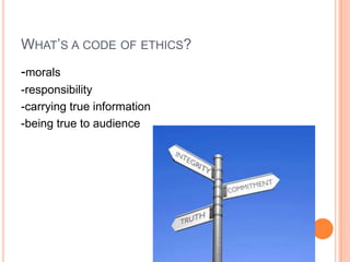 The code of ethics for journalists was developed in 1983 by the international journalism community to provide moral and responsible guidelines for carrying true information to audiences while rejecting anything that could harm people emotionally or physically. It outlines recommendations for journalists' relationships with their audience, sources of information, publicized individuals, colleagues, and authorities. The code constitution prohibits using journalism status for personal gain, following criminal codes, and engaging in war encouragement or propaganda. It also establishes journalists' rights to access information from organizations, attend events, and publish documents, recordings, and photographs obtained.