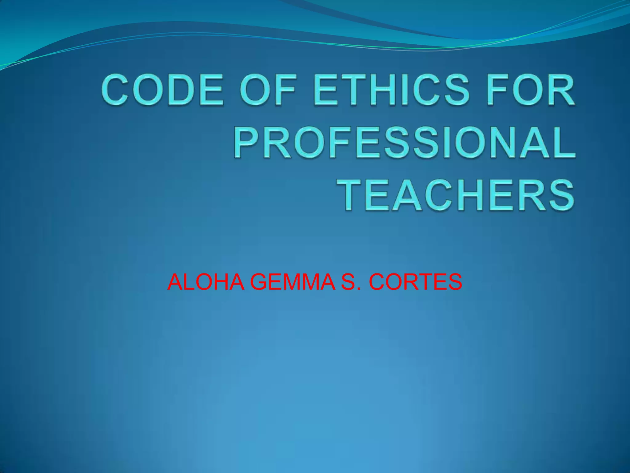 This document contains the Code of Ethics for Professional Teachers in the Philippines. It outlines the ethical responsibilities of teachers in their relationships with the state, community, profession, colleagues, and higher authorities. The code emphasizes that teachers must provide quality education, uphold moral and professional standards, and cooperate with others to improve the education system.