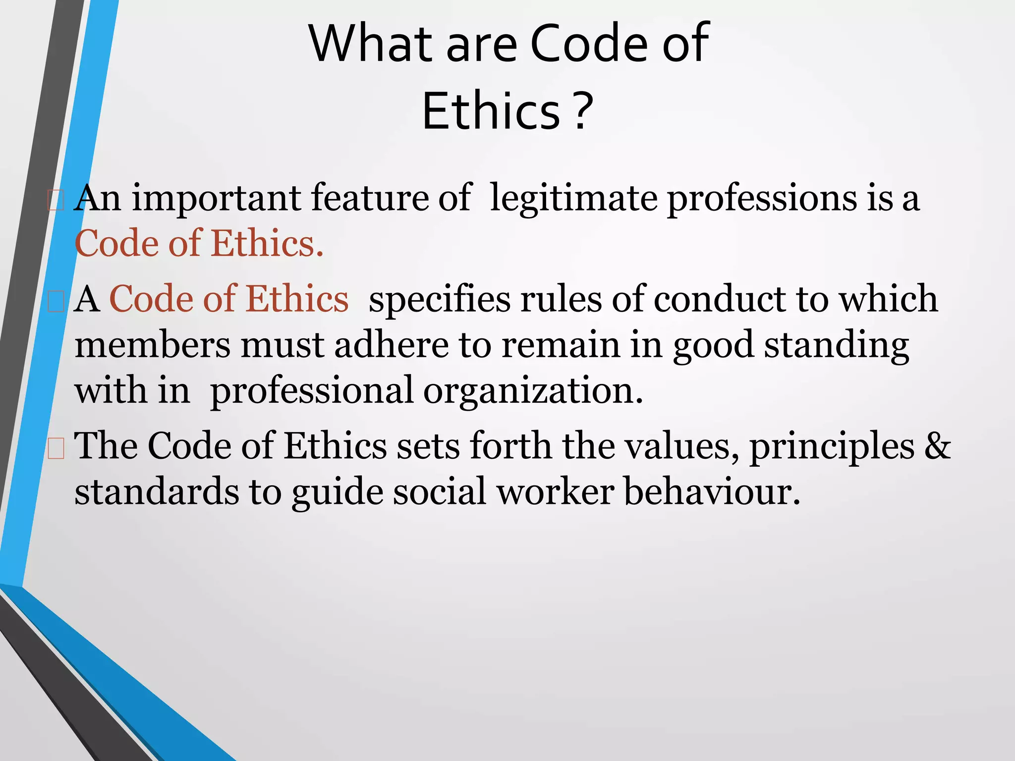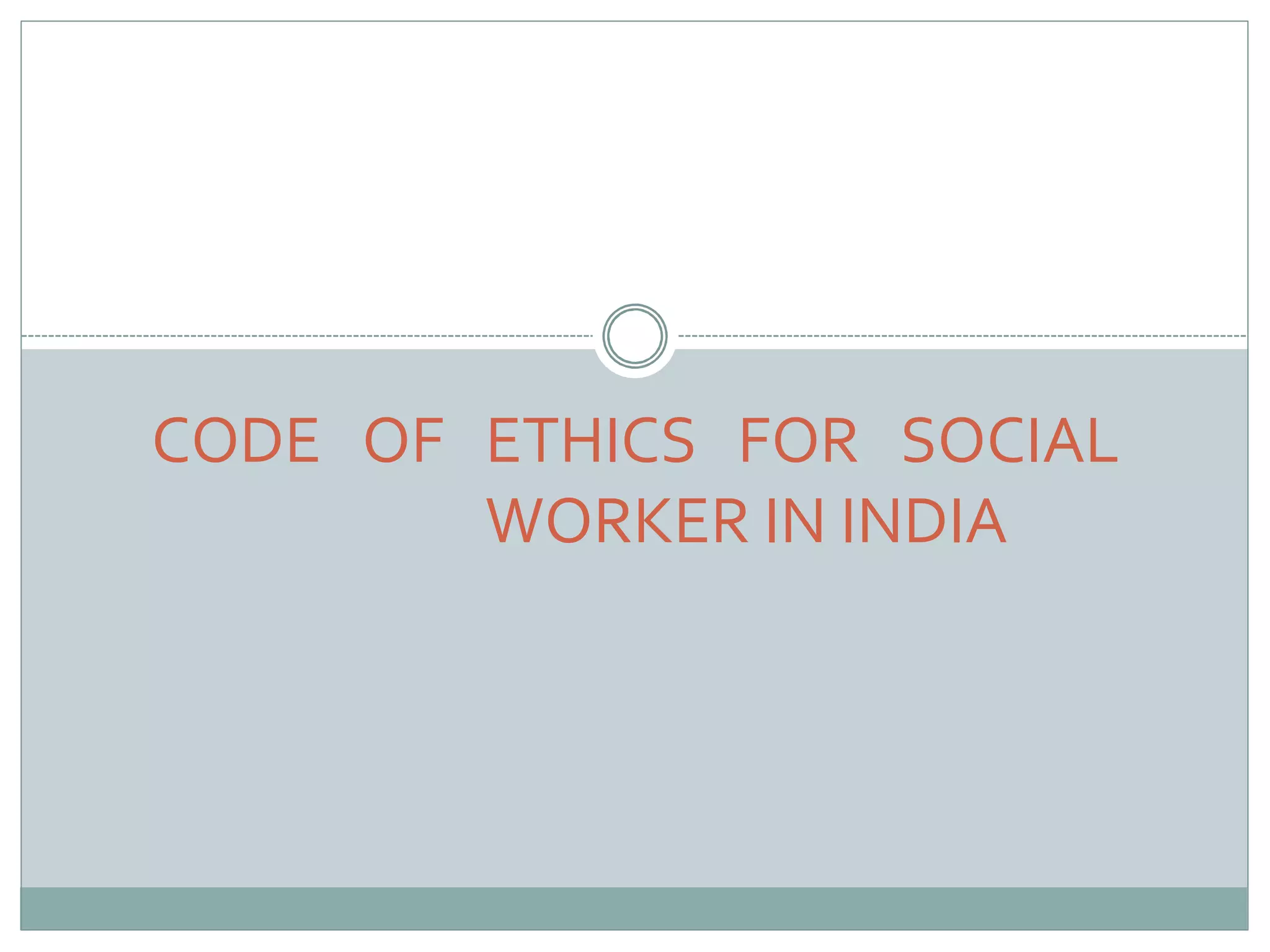 The document outlines the code of ethics for social workers in India. It establishes core values and principles to guide social worker behavior, including serving people in need, challenging social injustice, respecting human dignity, and practicing within one's competence. The code also identifies ethical standards concerning responsibilities to clients, colleagues, practice settings, the profession, and society. Its purposes are to identify foundational values, help navigate ethical conflicts, and provide accountability standards for social workers and the public.