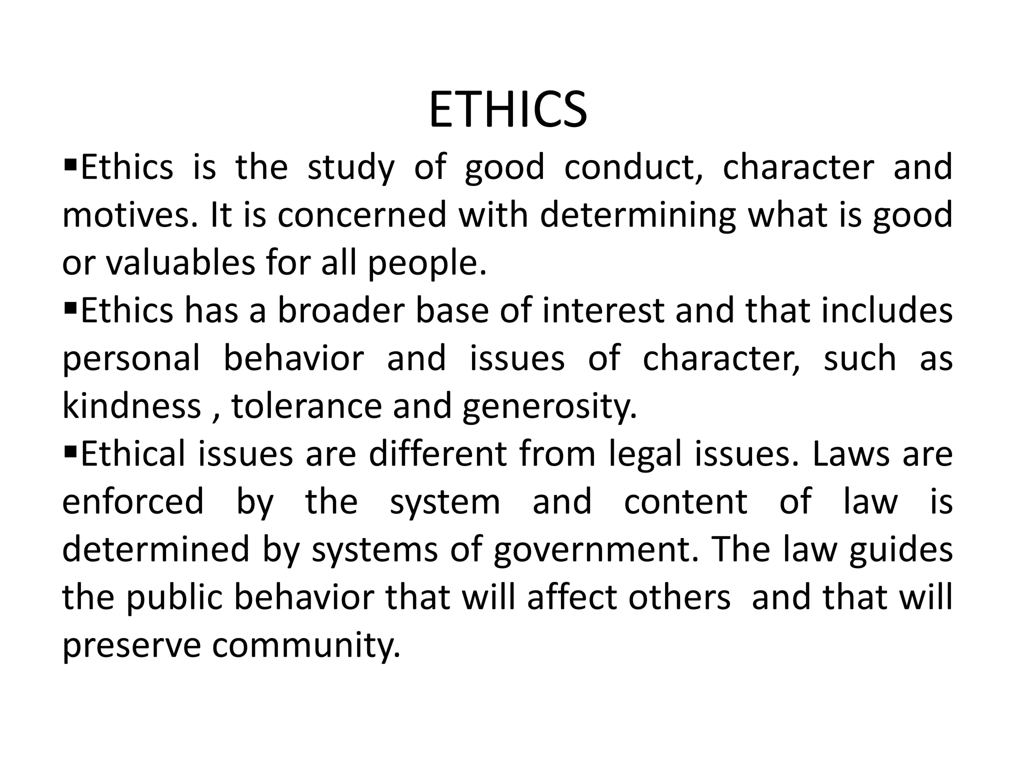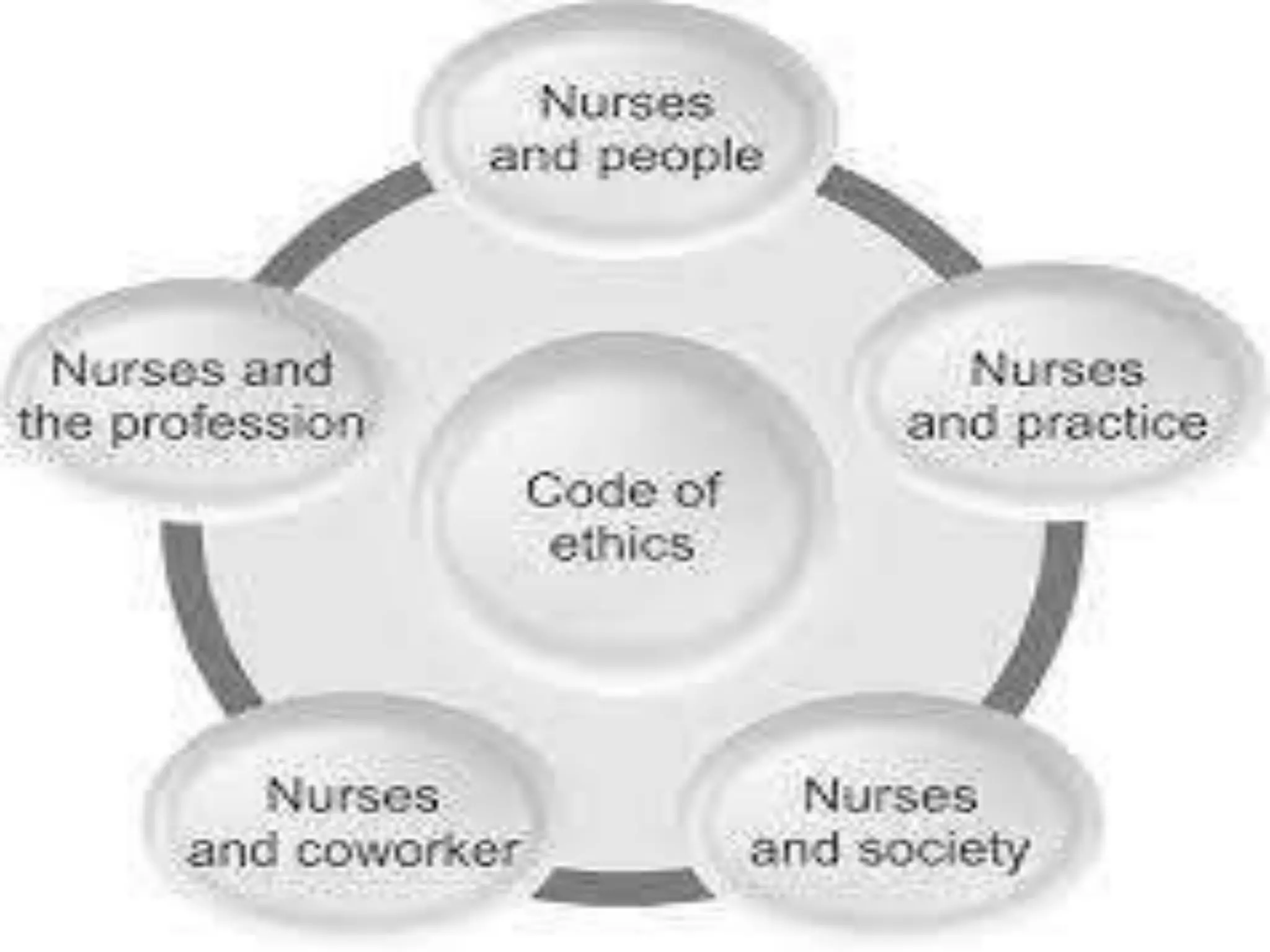 This document discusses ethics and the code of ethics for nurses according to the International Council of Nursing. It defines ethics as the study of good conduct and character and discusses ethical principles like autonomy, justice, and beneficence. The code of ethics guides nurses in their responsibilities to patients by respecting their values and keeping personal information confidential, to nursing practice by maintaining competence, to society by supporting public health needs, to coworkers by cooperating with them, and to the nursing profession by helping determine standards.