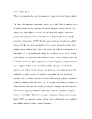The culture of a healthcare organization significantly impacts ethical decision-making. Small businesses focused on profits may lose integrity, while organizations promoting patient and community well-being foster ethical decisions. An organization's culture affects how staff responds to ethical dilemmas, as incentives could encourage unethical actions. However, cultures prioritizing increased health plans over ethical standards will struggle and require cultural changes.