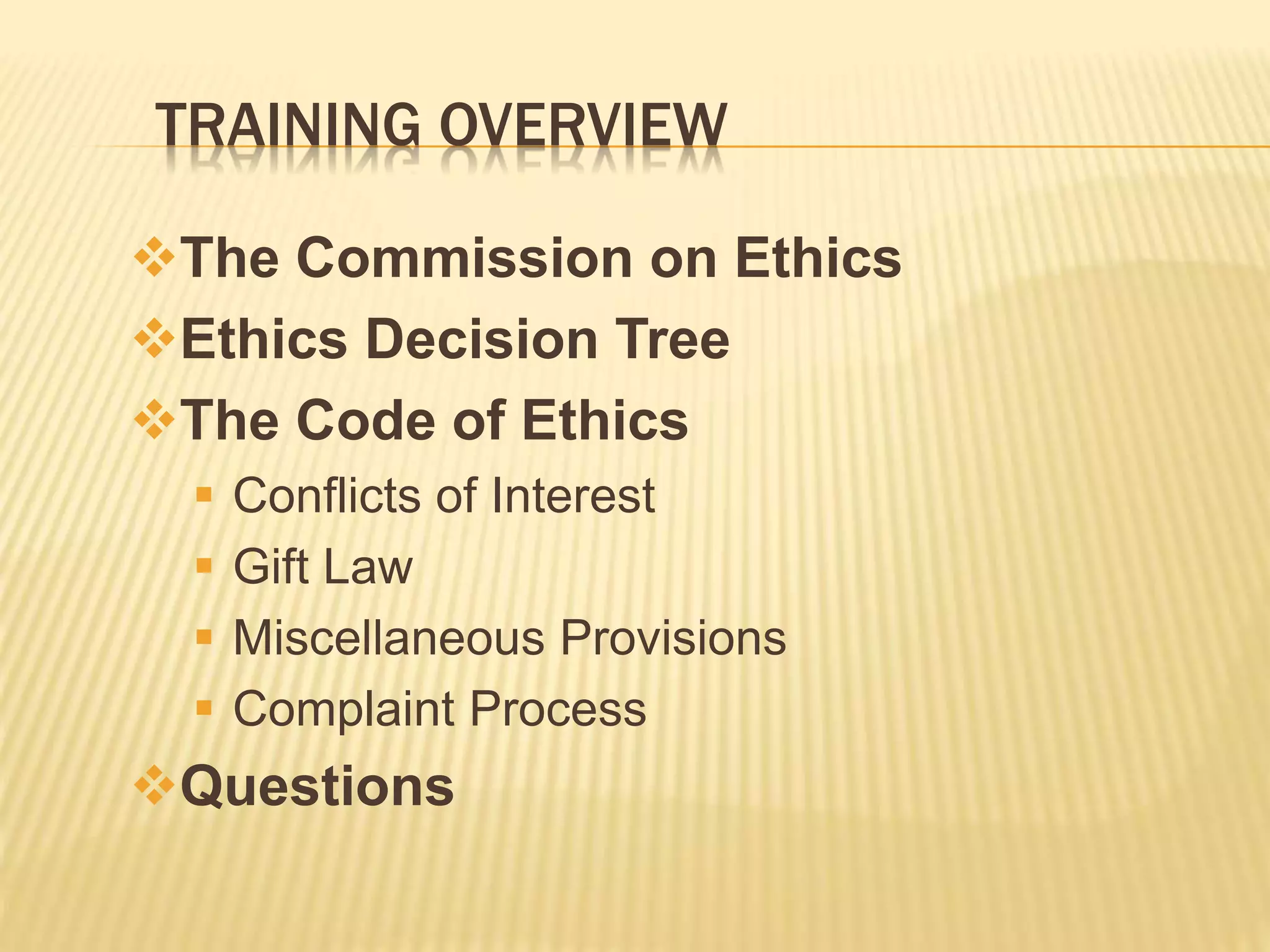 This document provides an overview and training on ethics rules for county and municipal officials, employees, and advisory board members. It discusses the Commission on Ethics, conflicts of interest, gift laws, contractual relationships, disclosure requirements, and other key provisions of the Code of Ethics. The training emphasizes using an "ethics decision tree" to determine if an action is legal, compliant with policies, and avoids any appearance of impropriety. It also provides examples of how to properly apply various parts of the code.