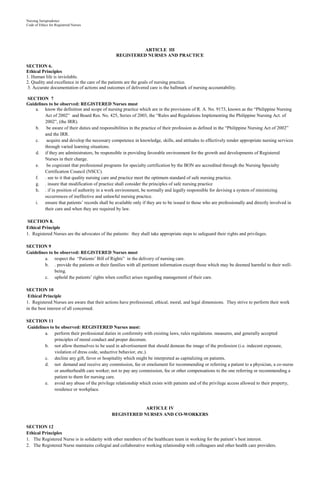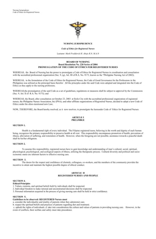 This document outlines the Code of Ethics for Registered Nurses as promulgated by the Board of Nursing in the Philippines. It establishes ethical principles and guidelines for nurses regarding their responsibilities to patients, nursing practice, coworkers, society, and the nursing profession. The Code is established to uphold the rights and welfare of patients, maintain standards of practice, and preserve the integrity of the nursing profession according to Philippine law. Non-compliance with the Code can result in suspension or revocation of a nurse's registration.