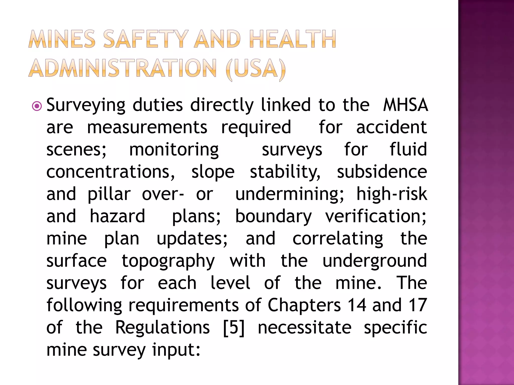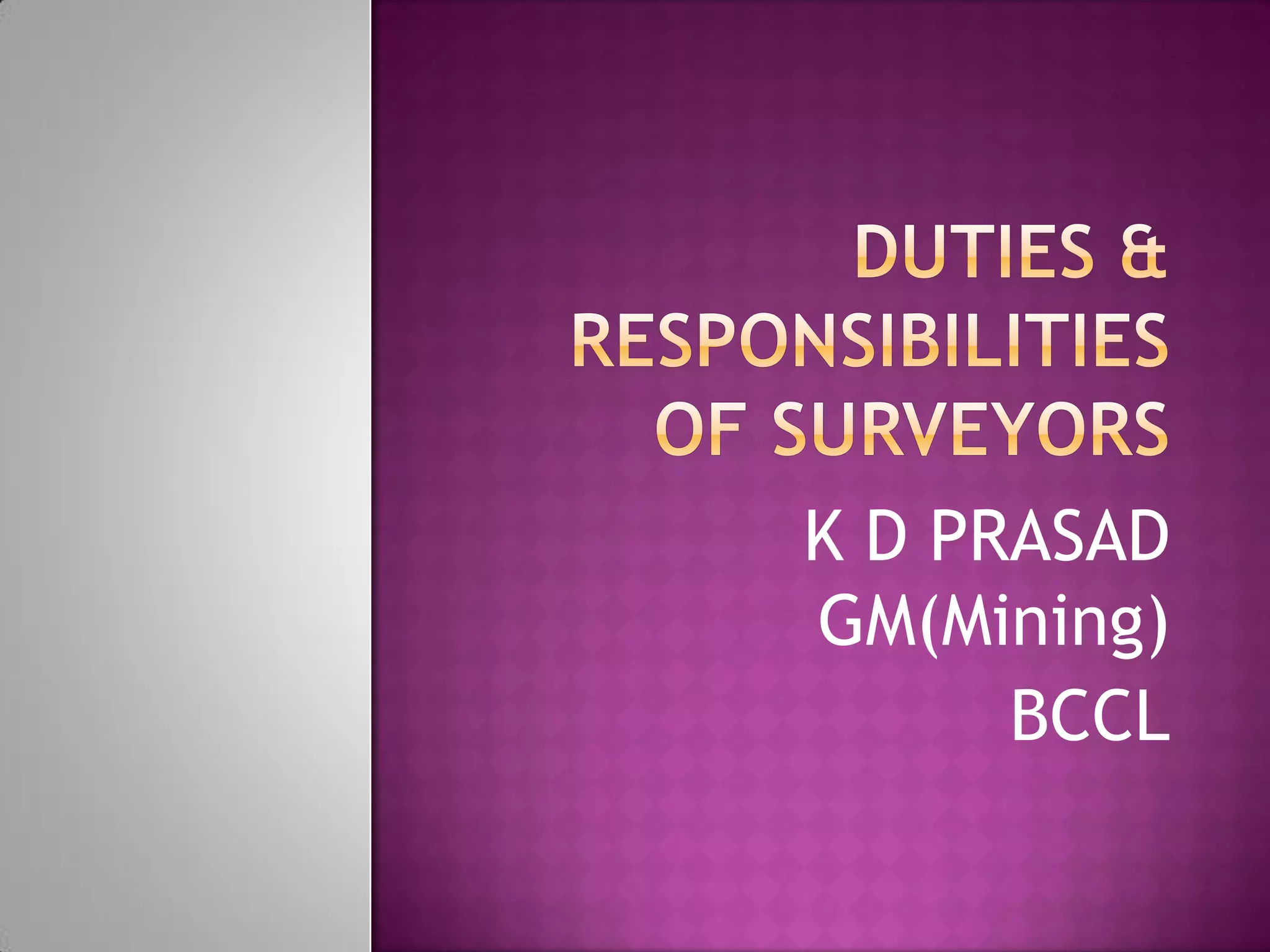 The document outlines the duties and responsibilities of mine surveyors according to coal mining regulations. It discusses requirements for accurate mine plans, monitoring safety risks, and ensuring proper drainage and flood control. Key responsibilities of surveyors include measuring accident sites, monitoring for subsidence and stability, updating plans, and correlating surface and underground surveys. They must also provide input on hazard plans, implement monitoring systems, and investigate community complaints.