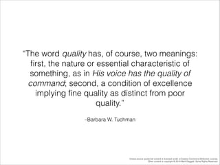 The document discusses various ways to measure code quality, including objective and subjective metrics. It describes metrics like cyclomatic complexity, Halstead metrics, and NPATH complexity which measure different aspects of code such as complexity, readability, maintainability, and testability. The document also discusses tools that can analyze code quality and produce reports on lines of code, arguments per function, and other metrics. Overall, the document provides an overview of different techniques for measuring code quality both quantitatively and qualitatively.