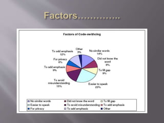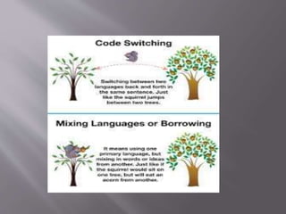 The document discusses code-switching, which refers to alternating between two languages or dialects during conversation. It provides several definitions of code-switching, including Gumperz's distinction between situational, metaphorical, intersentential, and intrasentential code-switching. The document also discusses reasons and functions for code-switching, such as filling gaps, avoiding misunderstanding, adding emphasis, or maintaining privacy. Finally, it notes that code-switching in the classroom can help students by providing instructions, explaining concepts, and defining difficult words to enhance communication.