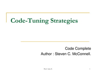 The document discusses strategies for code tuning to improve performance. It covers identifying areas of inefficiency through profiling, focusing on "hot spots" that consume the most runtime. Common sources of inefficiency include input/output, paging, system calls and interpreted languages. The document recommends an iterative process of measurement, optimization of hot spots, and remeasurement to evaluate improvements. It also cautions that code tuning should only be done after establishing correctness, quality and design to avoid detracting from the primary goals of development.