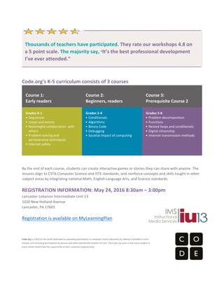Code.org offers a free, one-day workshop aimed at teaching elementary students the fundamentals of computer science through a combination of online tutorials and unplugged activities. The K-5 curriculum fosters creativity and problem-solving skills and aligns with national educational standards. The nonprofit organization aims to increase diversity in computer science education, ensuring every student has the opportunity to learn programming.