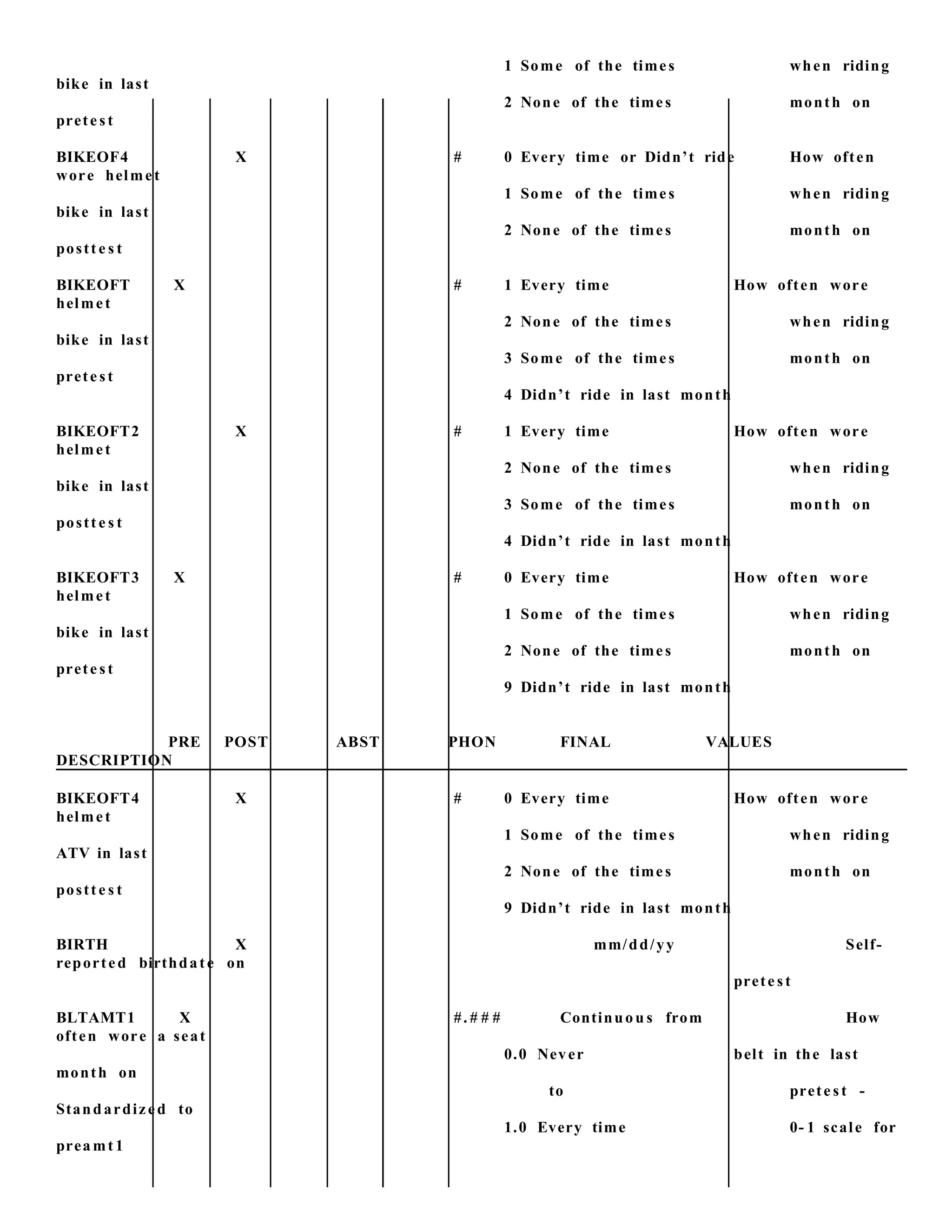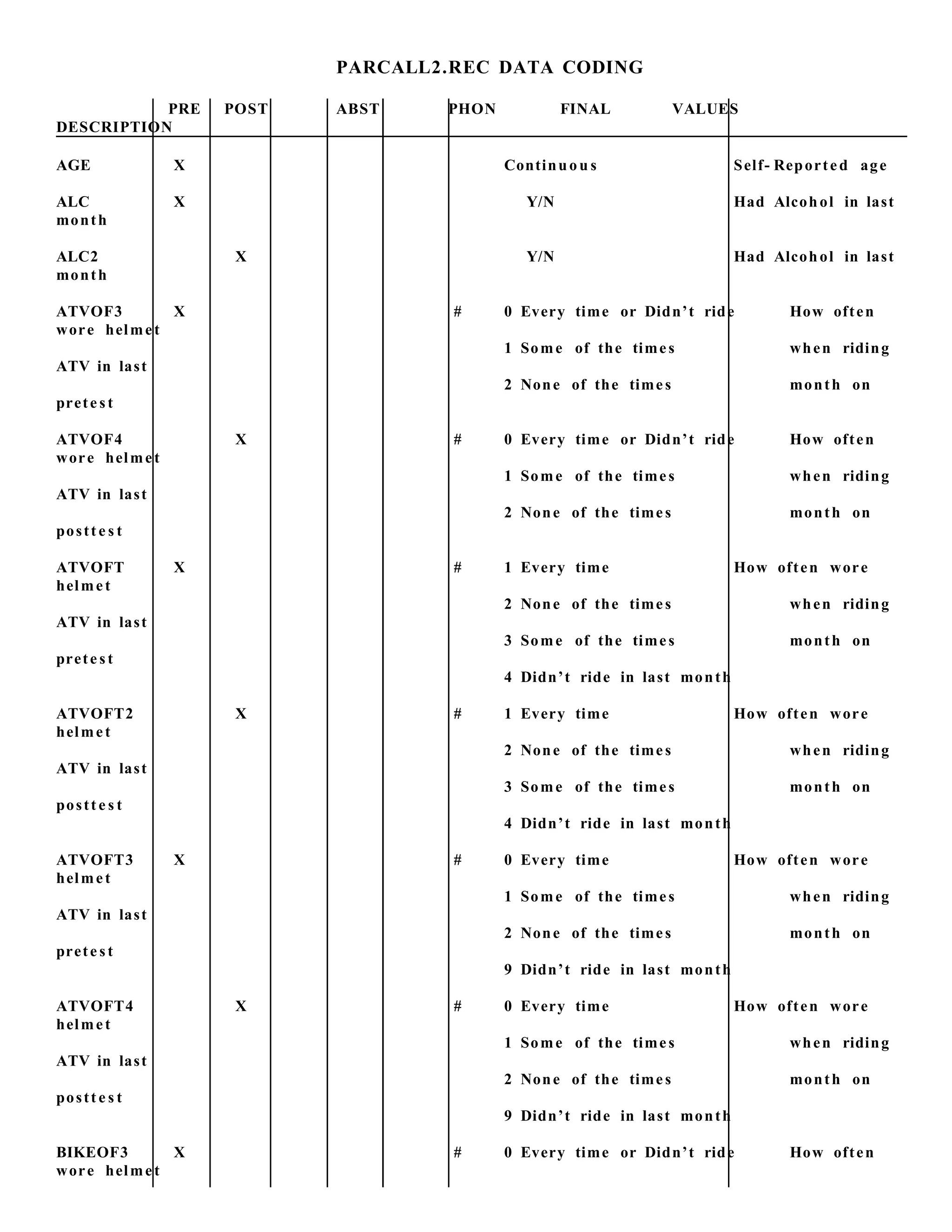 This document contains coding information for variables in the PARCALL2.REC dataset. It lists variable names, the type of data (e.g. continuous, categorical), possible values, and a brief description of what each variable represents (e.g. demographic information, behaviors, attitudes). There are over 100 variables described related to traffic offenses, risk behaviors, substance use, and perceptions of risk.