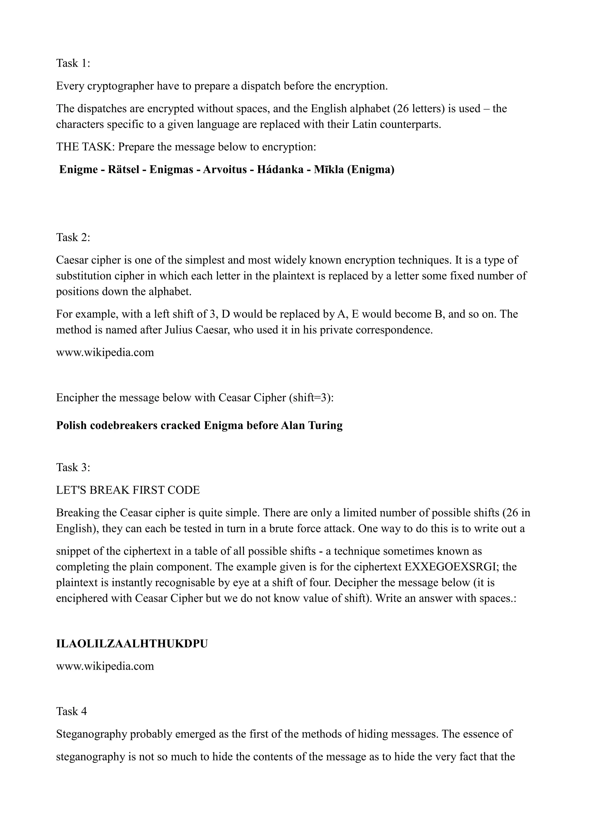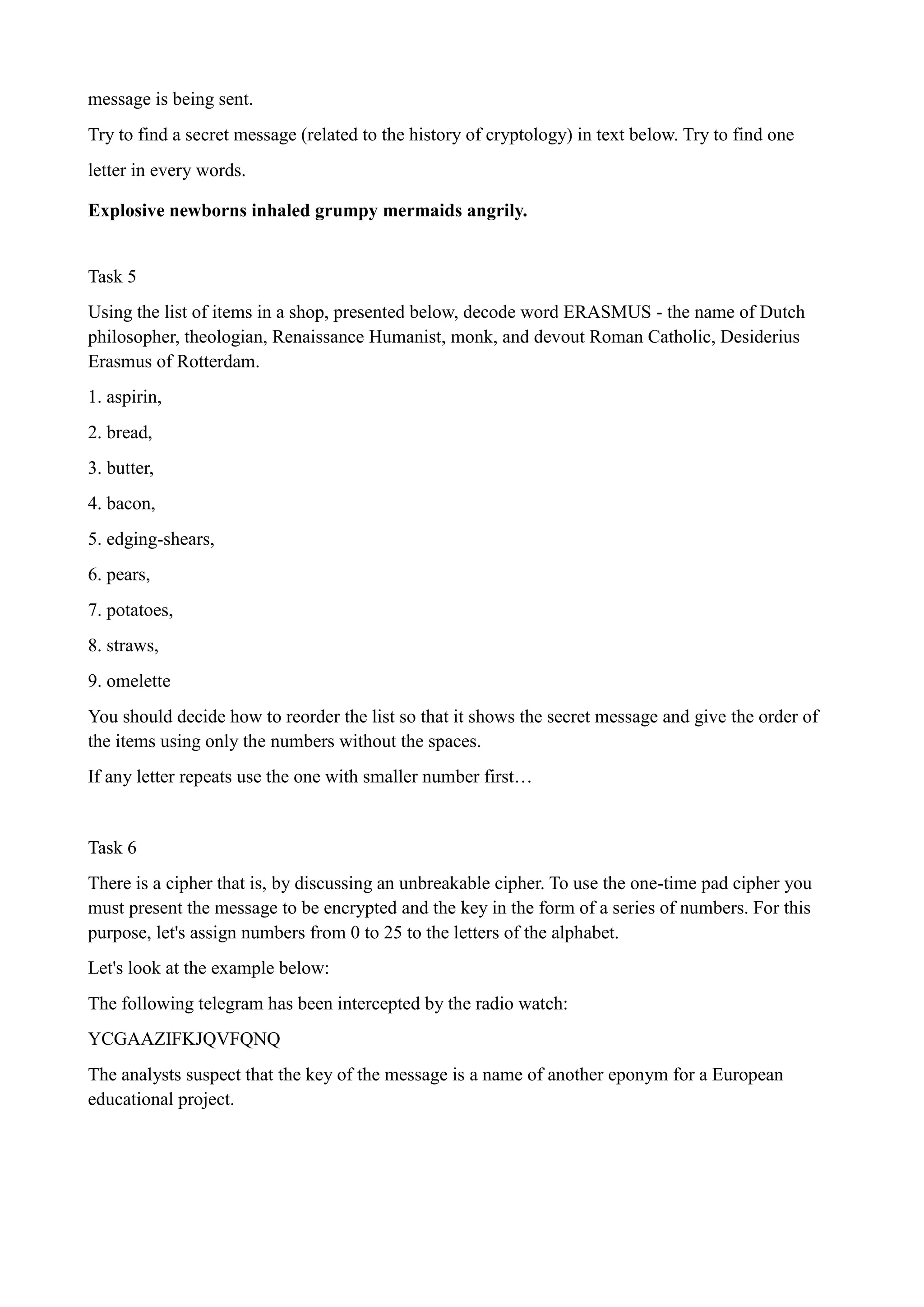 1. The document provides instructions for 6 encryption tasks: preparing a message for encryption, encrypting a message with Caesar cipher using a shift of 3, decrypting a message encrypted with Caesar cipher of unknown shift, finding a hidden message in text about cryptology, decoding a word using a reordered list of items, and encrypting a message with a one-time pad cipher using a key related to a European educational project.