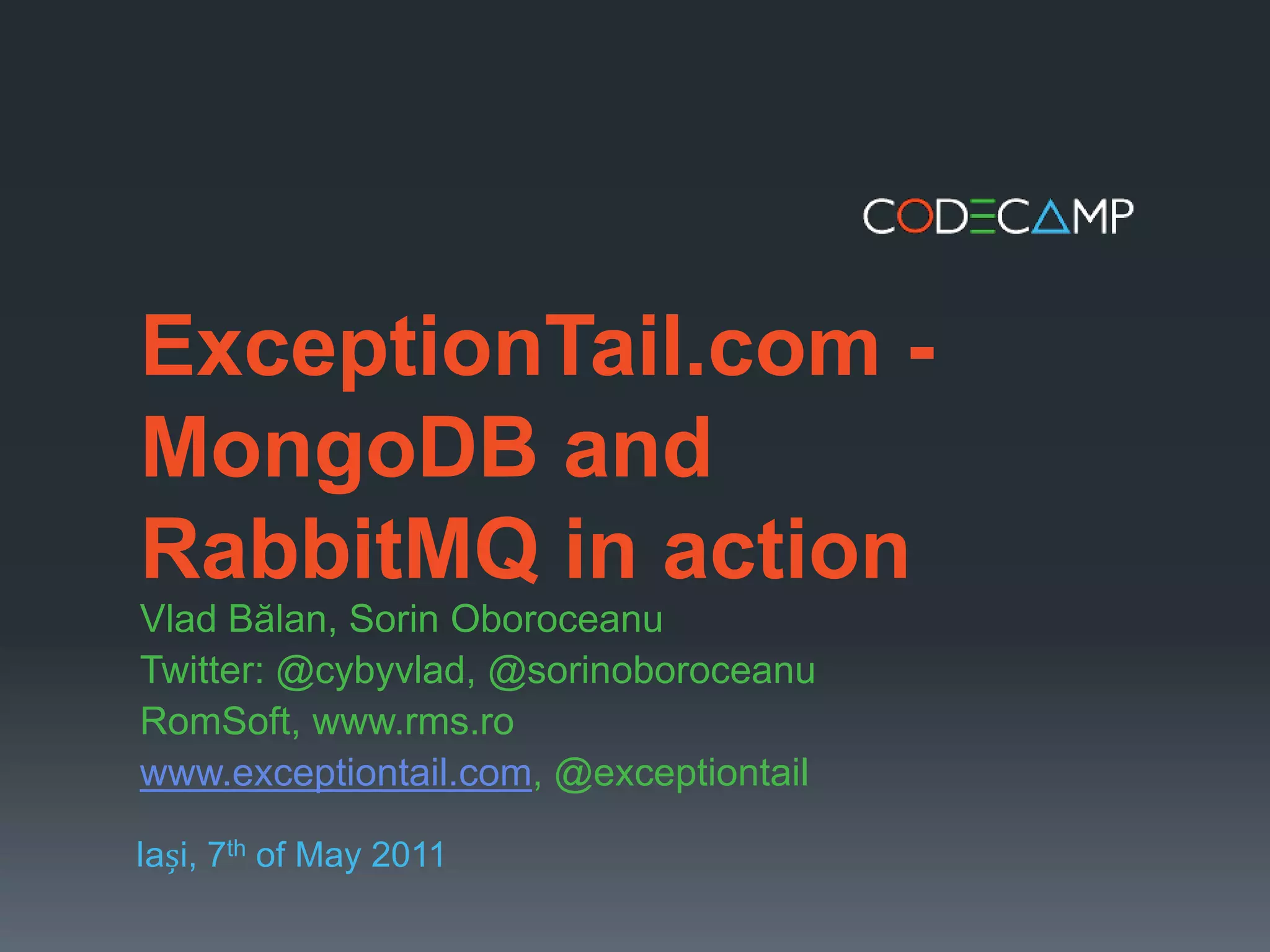 The document discusses the architecture of ExceptionTail.com, which uses MongoDB and RabbitMQ. It begins with how the authors started the project and wanted to use Linux and a NoSQL database. They describe their initial architecture using queuing with RabbitMQ to address load issues. They then discuss other architectures using replication and sharding with SQL Server. The final architecture shown uses MongoDB for the data store and RabbitMQ for queuing of messages to address scalability issues. The document concludes with a demo of MongoDB.