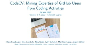 The document discusses the 'codecv' system designed for mining the expertise of GitHub users based on their coding activities. It identifies limitations in existing methods for expertise extraction and proposes a new approach using labeled latent Dirichlet allocation to link source code vocabulary with higher-level concepts. Initial results indicate that this method effectively identifies developer expertise with a focus on relevant source code rather than abstract concepts.