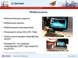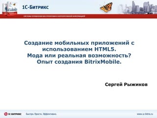 Документ обсуждает создание мобильных приложений с использованием HTML5, подчеркивая рост продаж смартфонов и важность мобильного рынка. Он описывает технологию BitrixMobile для разработки приложений и возможности интеграции с различными операционными системами. Также упоминается восходящая тенденция использования веб-приложений, доступных через браузеры, и платформы PhoneGap для создания нативных приложений.