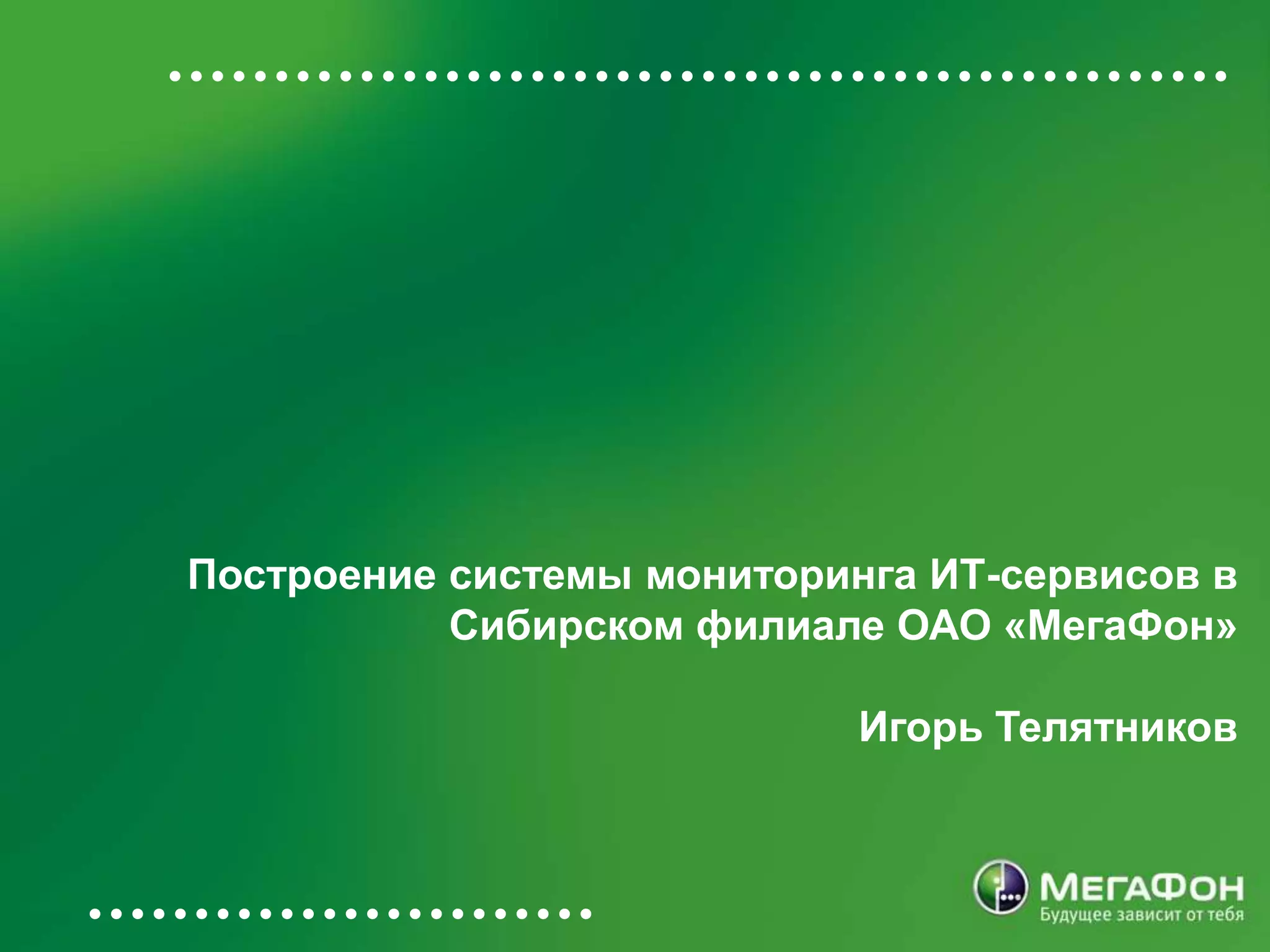 Документ описывает разработку системы мониторинга IT-сервисов в сибирском филиале ОАО «Мегафон», акцентируя внимание на важности качества обслуживания и проактивного мониторинга для обеспечения надежности услуг. Включает детали архитектуры мониторинга, используемые технологии, такие как SCOM 2007 R2, и преимущества, которые система приносит в виде снижения числа аварий. Также подчеркивается необходимость диагностики и настройки параметров мониторинга как стандартной практики для повышения конкурентоспособности.