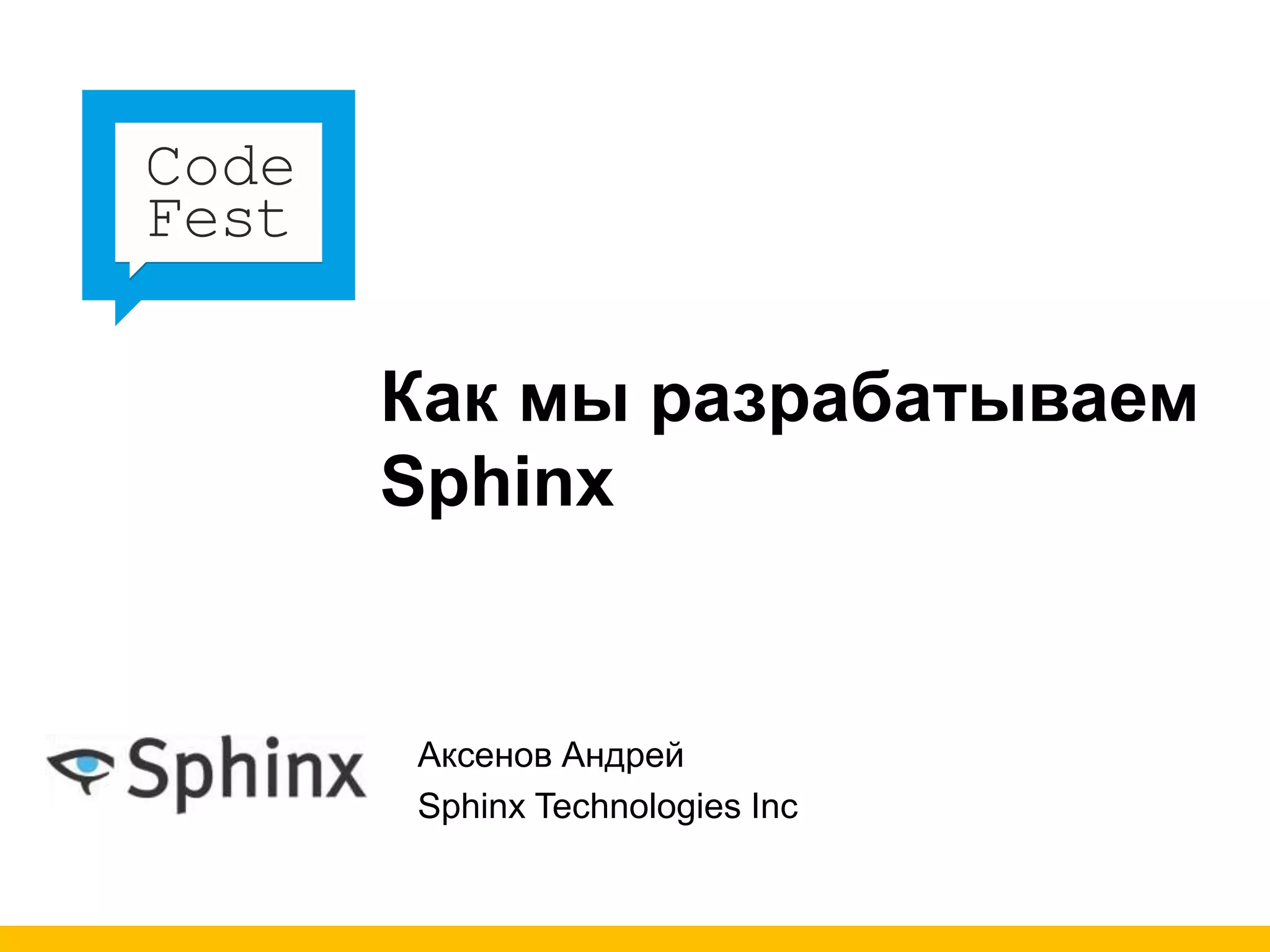 Документ представляет собой презентацию о разработке системы Sphinx, включая описания методов и процессов разработки. Освещаются темы инструментов, подходов к тестированию и управления версиями, а также обсуждаются проблемы, с которыми сталкивается команда разработчиков. Автор подчеркивает стандартные практики и подходы в разработке, а также важность документации и обратной связи от пользователей.