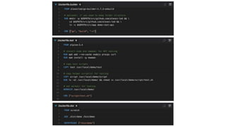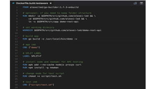 The document outlines testing strategies for Docker-driven development, emphasizing the importance of application portability, speed, and configuration. It discusses various approaches, including building demo applications and test containers, and the automation of CI/CD processes through dedicated Docker containers. Key benefits and drawbacks of each strategy are highlighted, along with recommendations for optimizing the Docker build flow.