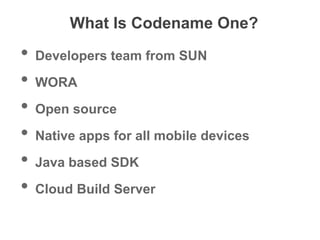 Codename One is a development framework created by SUN that allows developers to write native mobile apps in Java that can run on all major platforms. It provides an SDK and cloud build server so that developers can write their code once in Java and deploy created apps to iOS, Android, and other devices without having to use separate languages or write platform-specific code. Codename One handles the cross-platform deployment and provides features like GPS, maps, camera, contacts and more through its APIs and plugins.