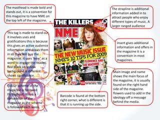 The document summarizes conventions used in music magazines, including: