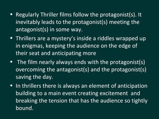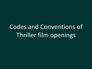 Thriller film openings typically introduce the protagonist and set up their encounter with the antagonist. They build tension through techniques like quick cuts, unsettling music, and shadowy lighting to keep audiences on the edge of their seats. Legally, films include copyright warnings and production company logos before titles introduce the director, producers, and lead actors. The thriller film "Panic Room" starts with an establishing shot of New York City set to tense music to immediately immerse viewers in the thriller genre. Within two minutes, the main characters and setting are established to move the plot along at a fast pace.