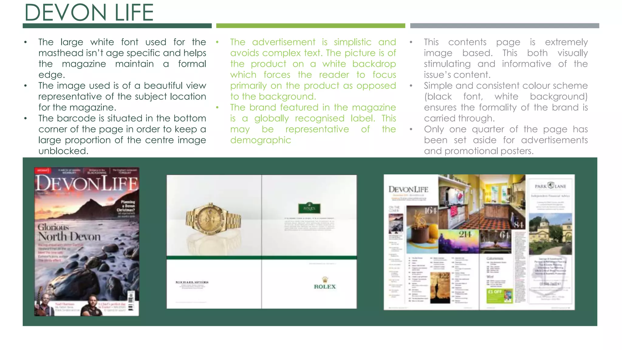 This document analyzes the codes and conventions used across several regional lifestyle magazines in the UK, including their use of imagery, advertisements, fonts, and layouts. Key observations include that magazines generally employ simple and consistent designs with a focus on attractive imagery to engage readers while also maintaining a formal and tidy appearance. Advertisements primarily feature single products or locally relevant businesses and are kept relatively simple to avoid distracting from the products. Imagery plays a large role in drawing readers in and representing the region or demographic featured in each magazine.