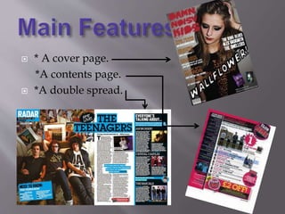 The document summarizes key elements of a music magazine, including the cover page, contents page, and double page spreads. The cover page aims to attract buyers with an eye-catching theme and main image. The contents page features images and brief descriptions of articles. Double page spreads typically contain a large main image taking up half the page, with a celebrity quote and free-flowing text relating to their personal or professional life. Consistency in themes, colors and layout is important across elements to engage readers.