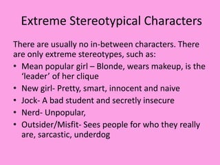 The document outlines some common codes and conventions of teen films and thriller films that could be incorporated into the opening sequence of a hybrid teen/thriller film. For teen films, it notes the use of extreme stereotypical characters, cliques, typical props like phones and cars, settings like high schools and malls, and common themes of love, arguments, and bullying. For thriller films, it discusses using brave protagonists, unknown antagonists seeking revenge, close-ups and quick cuts to build tension, sinister mise-en-scene elements, suspenseful music, and noir techniques like shadows and cliffhangers.