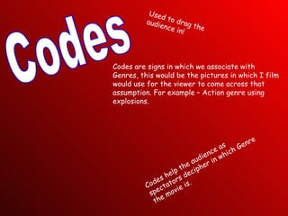 Codes and conventions are used in opening title sequences to signal the genre of the film to viewers and set expectations. Common codes include explosions for action films and deaths for horror films. Conventions like introducing main characters and setting help viewers identify the genre. The purpose is to provide the first impression, draw the audience in, and introduce key elements to strengthen their interest in the film.