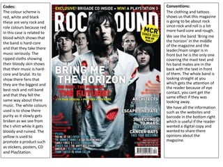 The document analyzes the codes and conventions used in magazine covers. It discusses four different magazine covers, noting the color schemes, placement of images and text, and other design elements used and what they are intended to communicate to readers. For each cover, it examines the symbolic meaning behind the colors, positioning of the celebrities/artists, and other graphical components and how they relate to the magazine's target audience and topic.