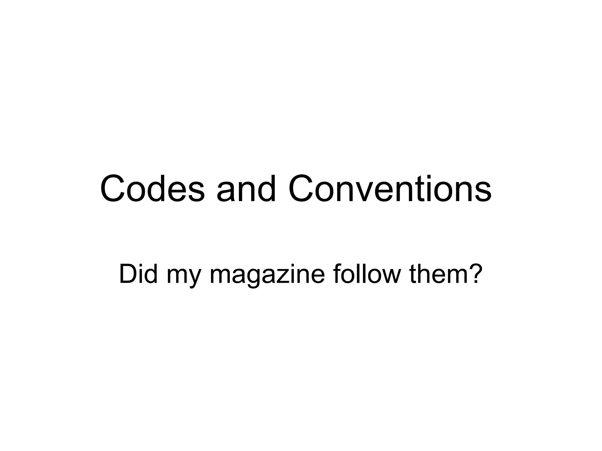 The document discusses the codes and conventions that the author followed in creating their own music magazine. It analyzes elements like photographs, layout, color schemes, fonts, and writing styles used in magazines like NME, Q, and Mojo as references. The author explains design choices made for the front cover, contents page, and sample article spread, noting how they did or did not follow typical magazine conventions.