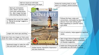 This document analyzes the codes and conventions used in magazine front covers. It discusses several magazine covers, noting elements like titles, images, color schemes, and layouts. Common conventions like barcodes and issue numbers are mentioned. Unconventional elements are also analyzed, like an unusual barcode placement. The target audience and aesthetics are considered. Inspiration is drawn from minimalist designs and template-like layouts that feature subheadings. Sticking to conventions is advised, unless a brand is very well-established.