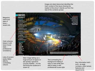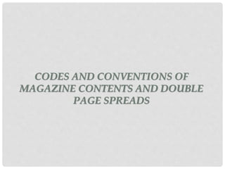 The document provides examples of codes and conventions used in magazine contents pages and double page spreads. It analyzes magazines like Country Weekly, NME, Billboard, Maverick, and Q. Some common conventions highlighted include using large prominent images, consistent color schemes, bold text for key information, separating sections clearly, and drawing attention to main articles. Maintaining a magazine's house style and using techniques like direct address, pull quotes, and drop caps helps engage readers.