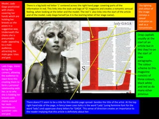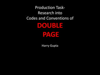 The document analyzes the codes and conventions used across multiple magazine double page spreads featuring different artists. It describes visual elements like placement of images, use of colors, fonts, and layouts. It also discusses textual elements such as quotes, titles, and language. Key conventions highlighted include positioning images on the left, using limited text in columns, and incorporating the magazine's house colors and styles.