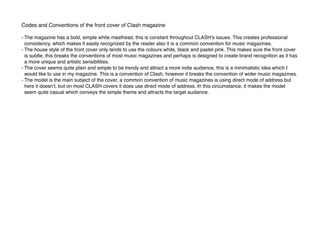 - Clash magazine uses a simple white title and images to attract readers. It contrasts images with actual appearances.