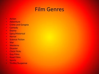 This document discusses the codes and conventions of different film genres including crime films, disaster films, and horror films. For crime films, typical elements include chases, weapons, revelations about the villain, partnerships between heroes, and betrayals. Disaster films commonly feature heroic characters attempting to prevent or survive natural or man-made catastrophes through special effects-heavy stories. Horror films aim to scare audiences with weapons, dark settings, invincible killers, unsettling sounds, and costumes that conceal identities.