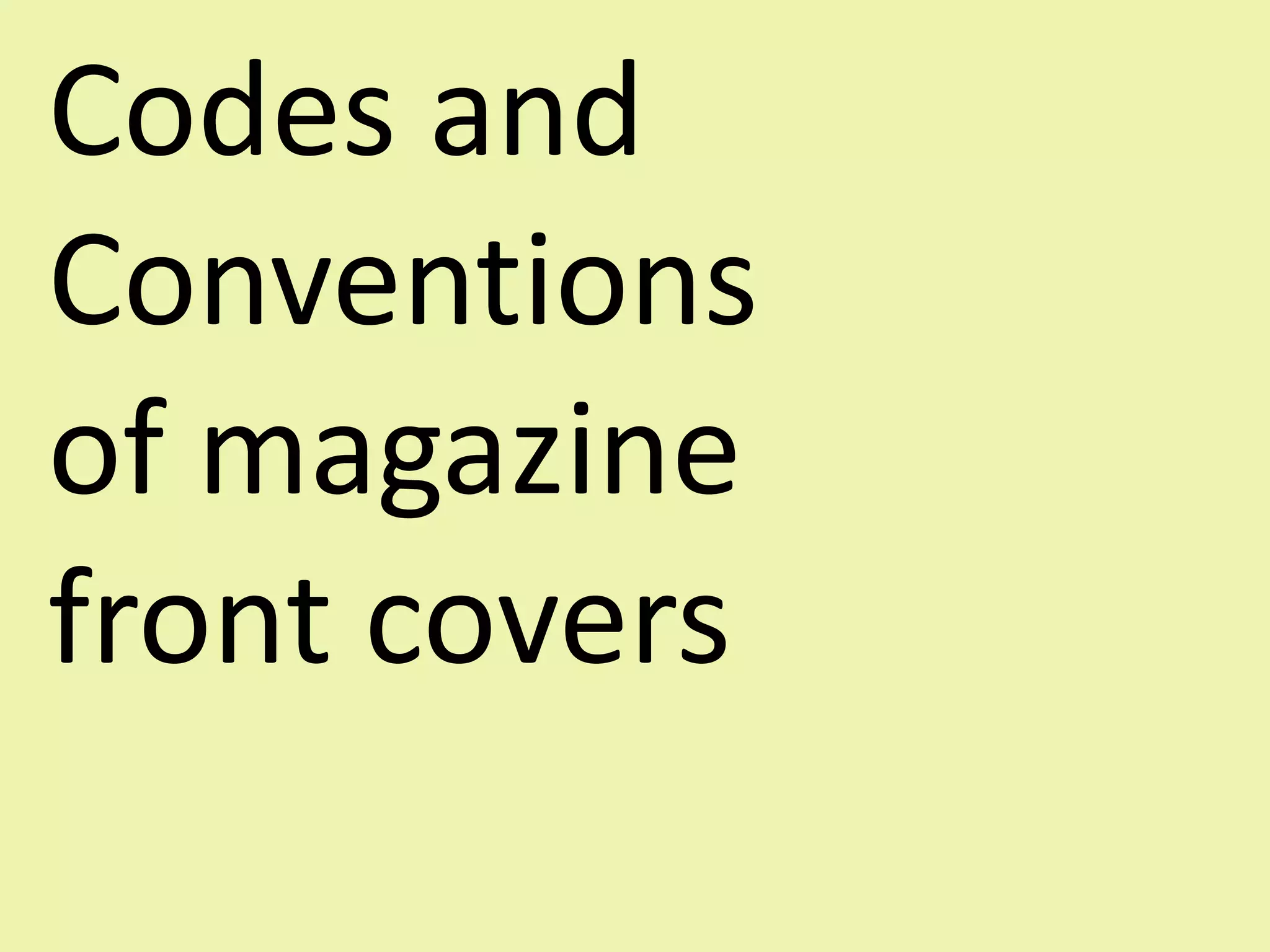 The document discusses codes and conventions used on magazine front covers, including: