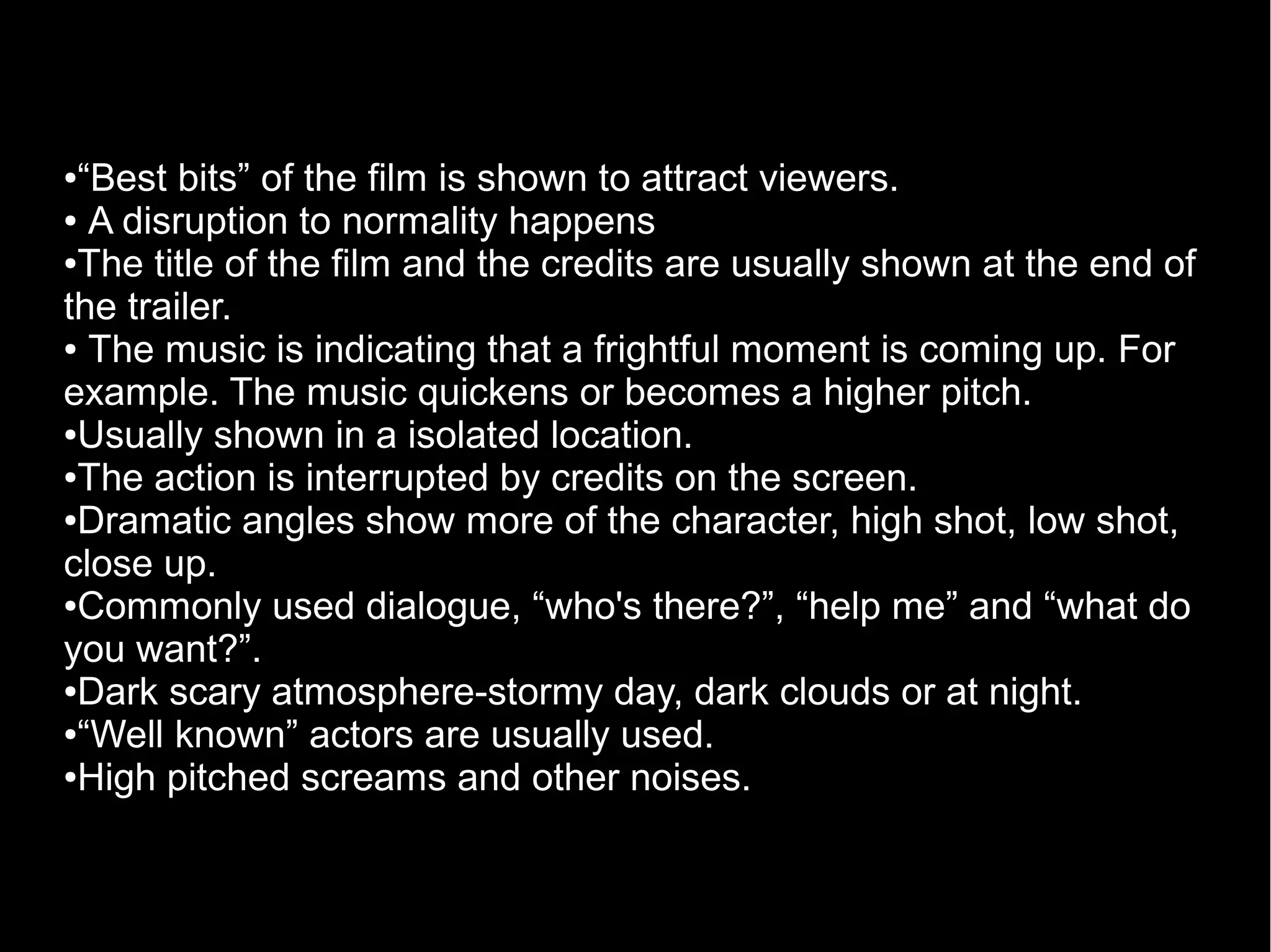 This document analyzes conventions used in horror film trailers, using three specific trailers as examples. It finds that trailers typically open with the production company logo in a dark, ominous style. Lighting switches between bright and dark to show normal vs disrupted situations. Character appearances use makeup to appear distressed, tired, or abnormal. Shots like low angles make characters seem vulnerable while high angles make them seem less important. Titles usually have a plain black background with white text to suggest something opposite of normal.