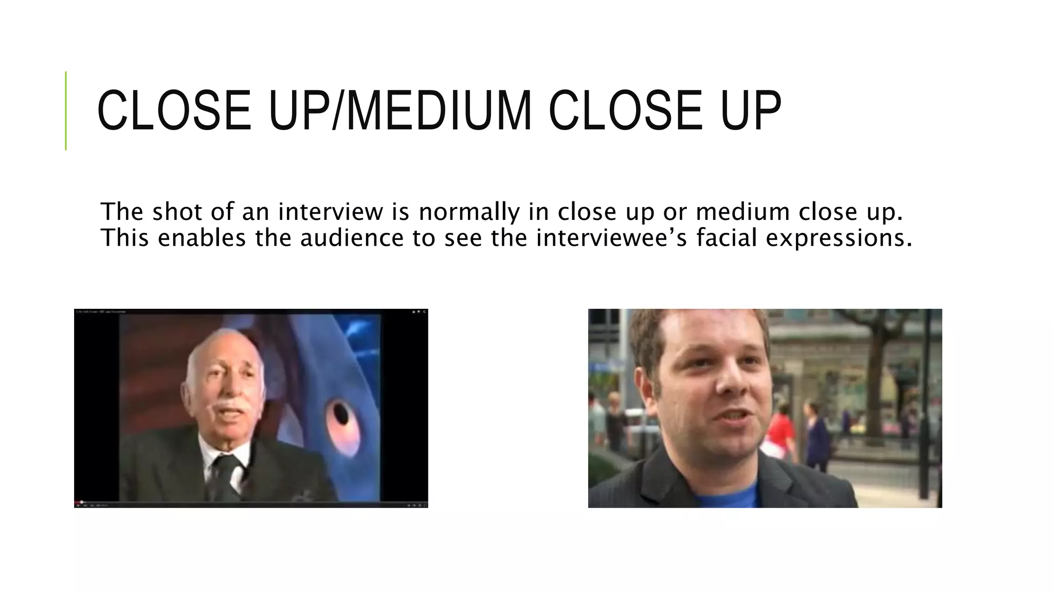 Interviews follow certain conventions including close-up or medium close-up shots of the interviewee to see facial expressions, positioning the interviewee off to one side of the screen following the rule of thirds, and having the interviewee look at the interviewer rather than directly at the camera. Relevant items may be included in the background visuals. Graphics are sometimes included with the interviewee's name and relevance. The camera remains static and at eye level to focus on the interviewee's words, and cutaways to related footage are sometimes included between responses.