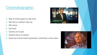 The document outlines codes and conventions for filming interviews, including using the rule of thirds composition, mid shots, eye level camera placement on a tripod with shallow focus. It discusses lighting, actors' movement and expressions, makeup, props, and relevant settings for mise-en-scene. Graphics should include the interviewee's name and relevance in different sized fonts. Editing involves using cutaways of relevant footage or archives under 30 seconds to maintain interest and transition between speakers, and questions must be edited out.